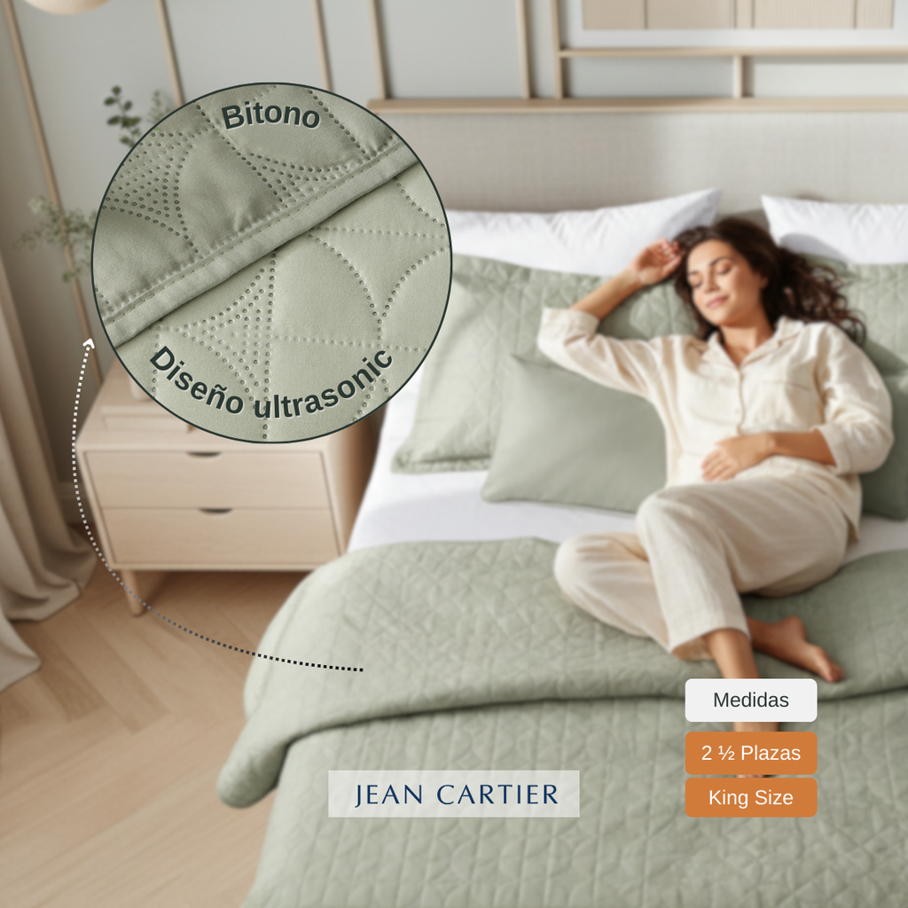 El Kit de 4 Piezas Jean Cartier bitono incluye un cover elegante y suave, acompañado de fundas de almohadón y un cojín decorativo con relleno, brindando un estilo sofisticado y funcional para tu dormitorio.